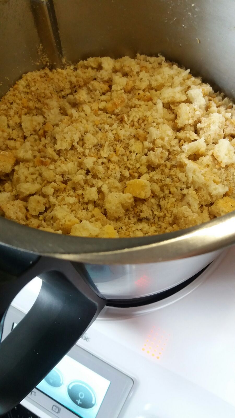 1-Trocea el pan 15 seg /vel 7 y reserva en una bandeja amplia.