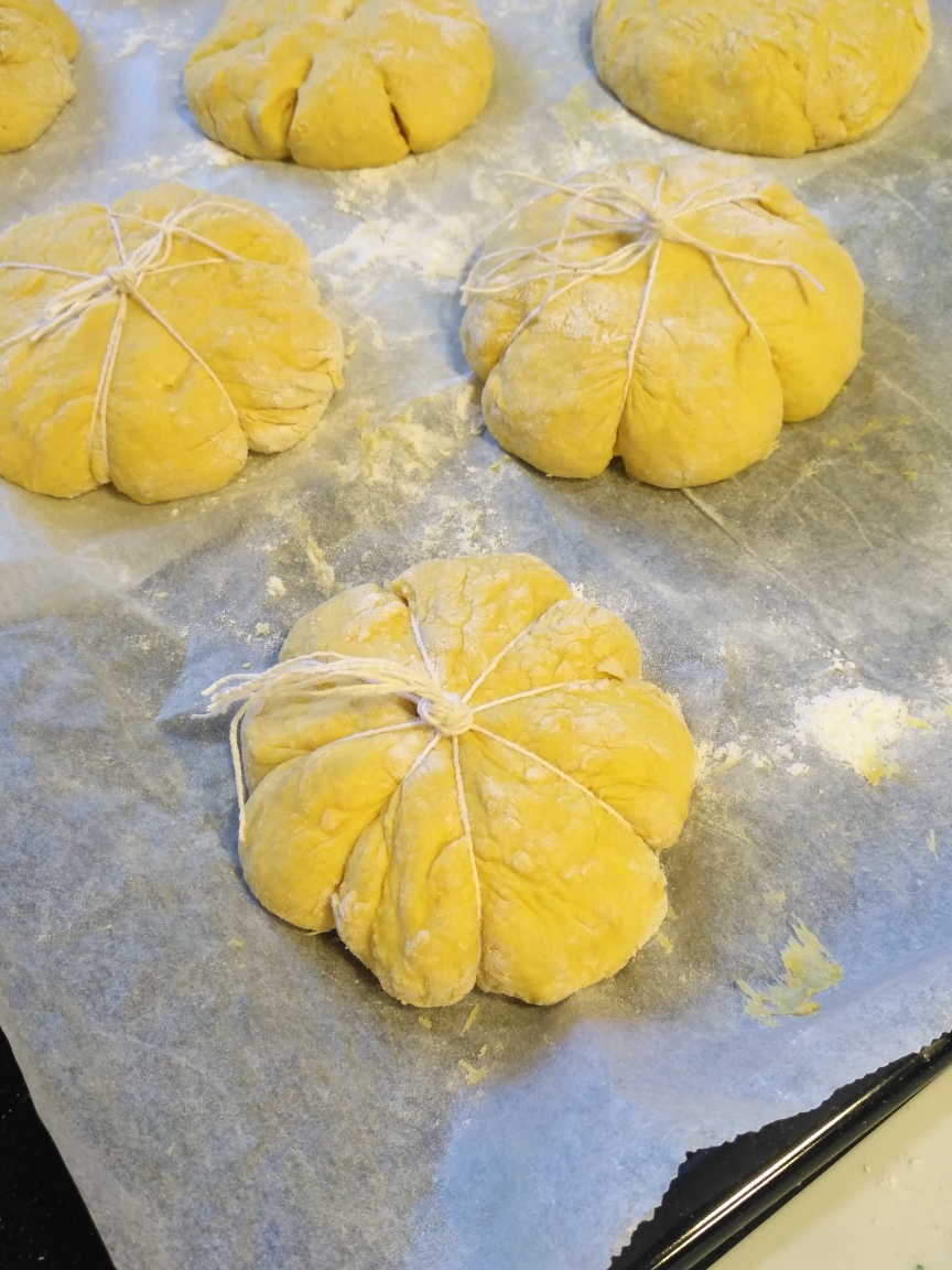 PASO 5. MONTAJE. Precalentar el horno a 200ºC. Por cada panecillo, cortamos 4 hilos gruesos de cocina de unos 40cm y cada 4 hilos se anudan por el centro; así tantos, como panecillos se quieran hacer. Colocamos los hilos en la encimara, extendidos y abiertos en cruz y se coloca un panecillo y se ata apretando un poco para que quede marcado. Repetimos con cada panecillo. Colocamos en la bandeja del horno.