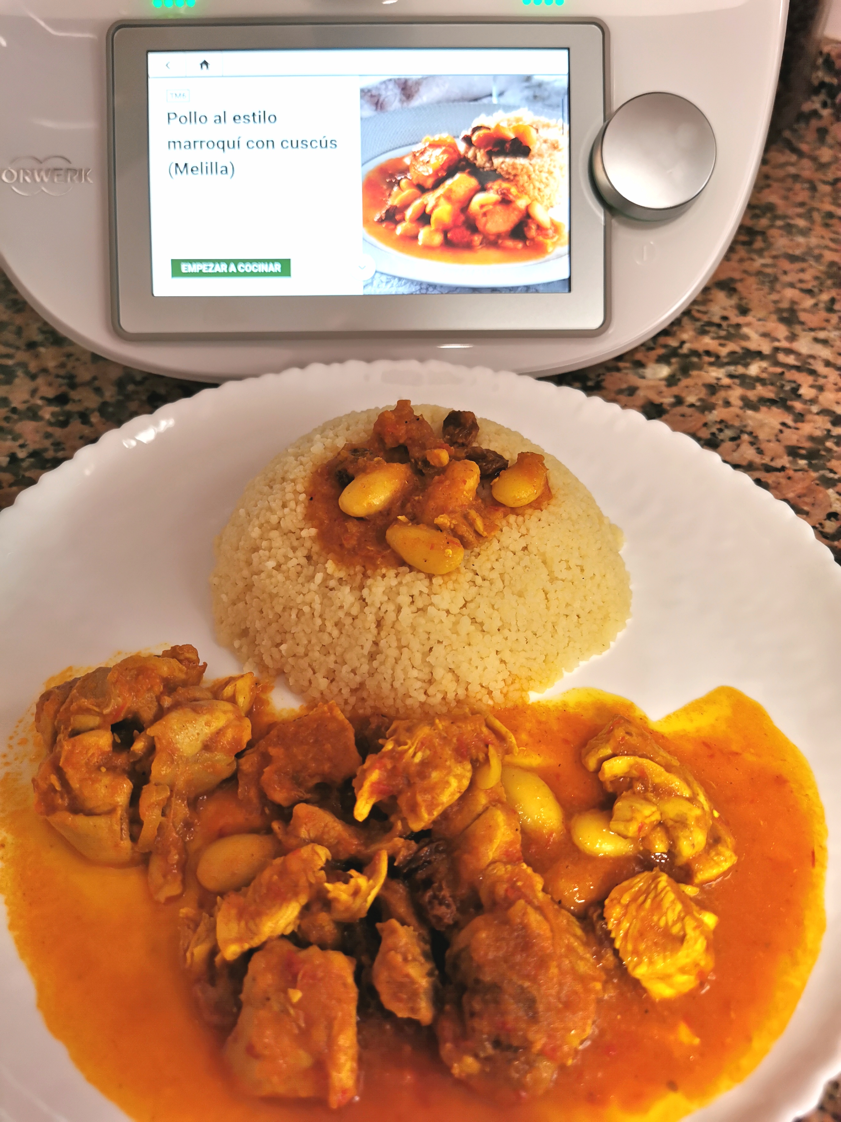 - Pon en el vaso el agua, el aceite y la sal y caliente 7 min/100°C/vel 1. Vierte sobre el cuscús reservado y mezcla con la espátula. Deja reposar durante 5 minutos y sirva con el pollo.