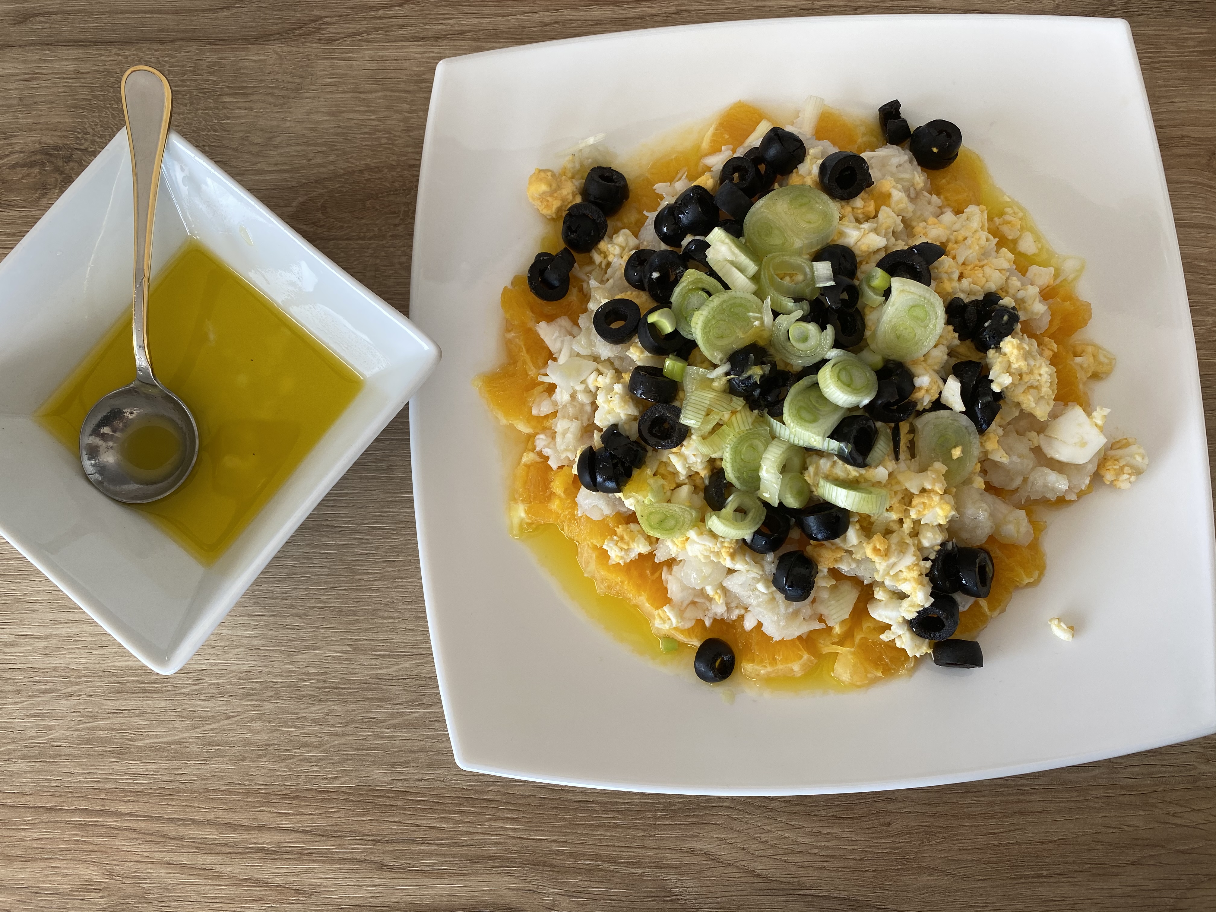 Ponga las naranjas en una fuente y repartimos la cebolleta picada. Colocamos encima el bacalao , ponemos el huevo picado las aceitunas negras y los tallos de cebolleta en rodajas y por último ponemos la vinagreta se toma fria