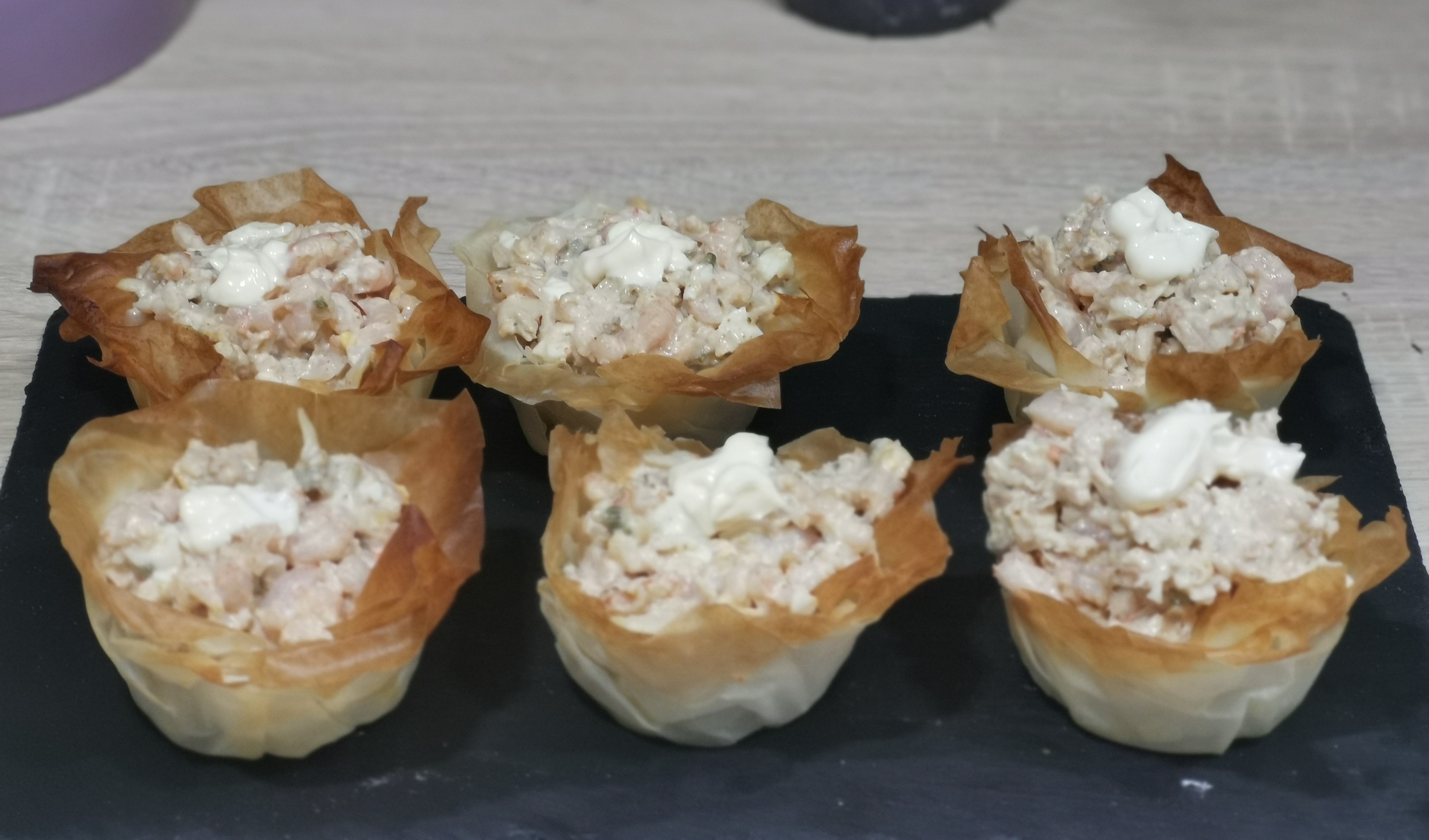 Coloque cada cuadrado de pasta en los huecos de un molde de 24 minimuffins y empújelo suavemente hacia el fondo para cubrir bien el hueco. Hornee durante 5 minutos (200°C). Retire las tartaletas del molde, colóquelas sobre papel de cocina y deje enfriar. Repita con los cuadrados de pasta filo restantes.