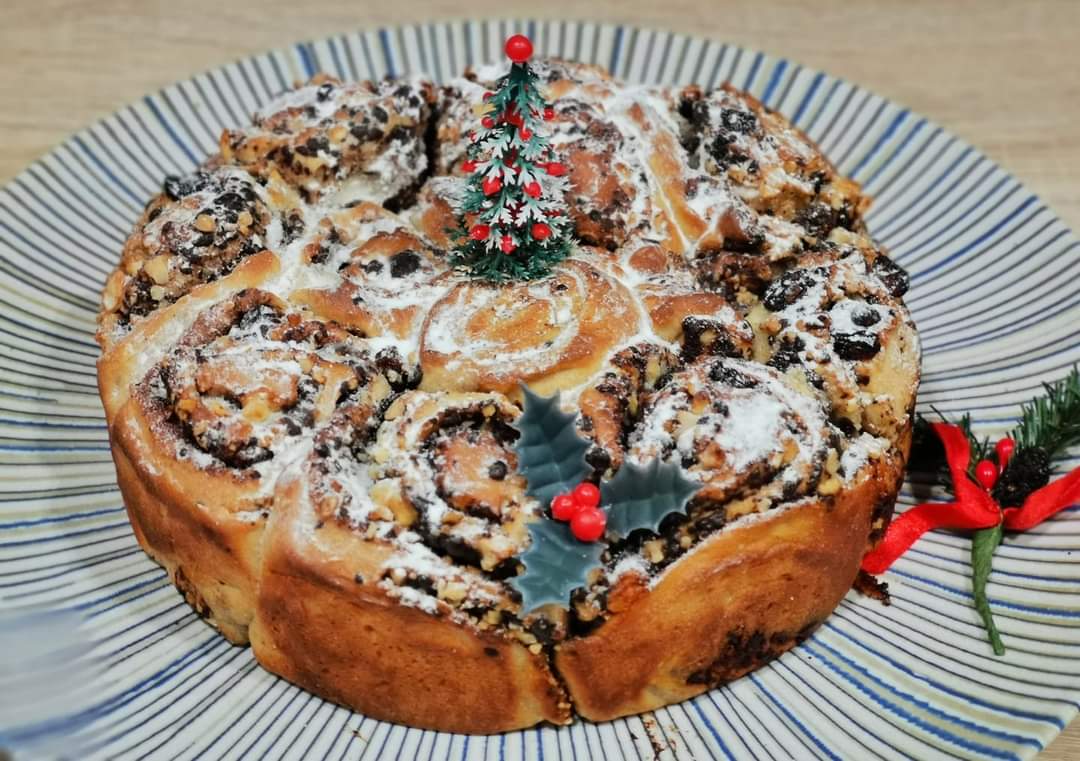 Roll de chocolate, frutos secos y canela.